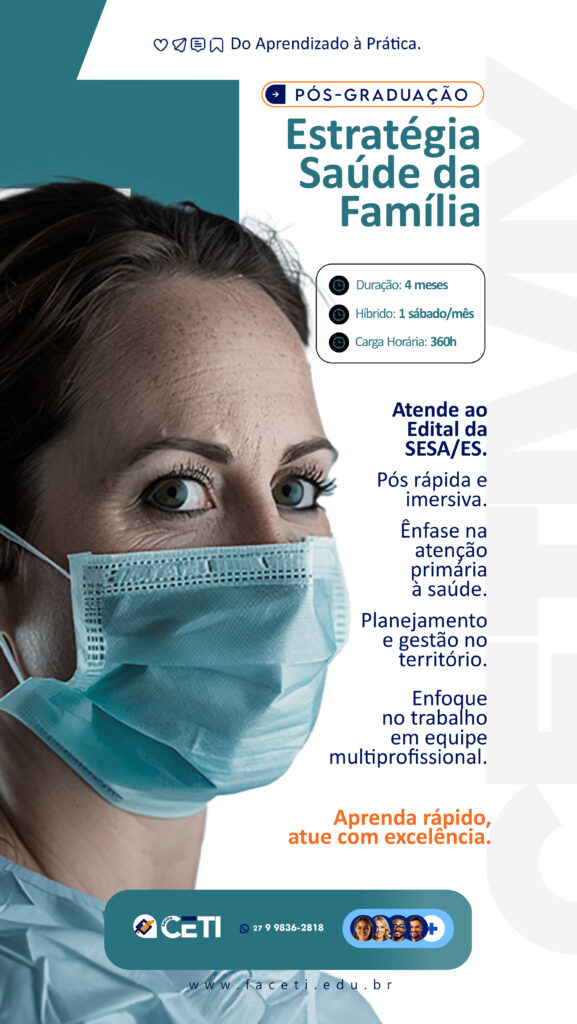 O CETI VIX lança a Pós-Graduação em Estratégia Saúde da Família, uma formação acelerada e imersiva voltada para enfermeiros e demais profissionais da saúde que desejam participar do processo seletivo da SESA-ES. O curso atende integralmente às exigências do edital, oferecendo uma capacitação prática e direcionada à realidade do SUS. Com docentes experientes e metodologia dinâmica, a especialização prepara o profissional para atuar com excelência na Atenção Primária, fortalecer o cuidado comunitário e conquistar novas oportunidades na rede pública de saúde.